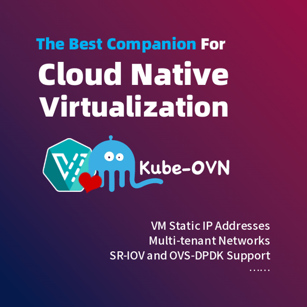 In this blog post, we described several interesting use cases and special considerations when designing the network fabric for cloud native virtualization. The KubeVirt community has contributed to a number of virtualization related features in Kube-OVN, including VM static IP addresses, multi-tenant networks and SR-IOV and OVS-DPDK. We see Kube-OVN as a great companion for KubeVirt, and when used together, they really light up the cloud native virtualization experiences. We hope more users from the KubeVirt community will try out these features and give us feedback.